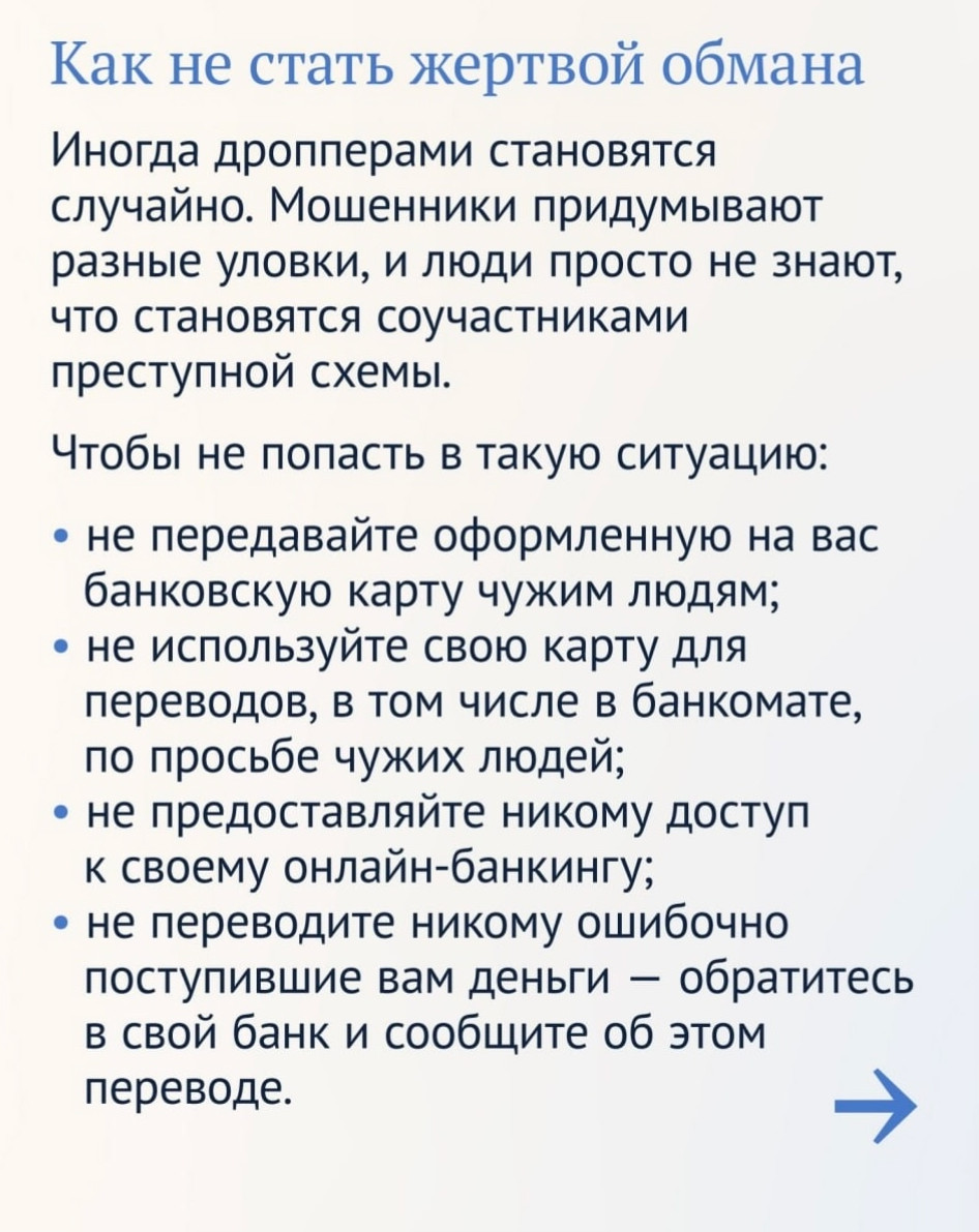 Теперь обналичить деньги, добытые обманным путём, станет сложнее. С 15 мая вступает в силу новый закон, который ограничивает переводы для так называемых дропперов — людей, которые помогают мошенникам выводить деньги. Они не смогут переводить себе или другим более 100 тысяч рублей в месяц.Эта мера прописана в законе о "периоде охлаждения" для потребительских кредитов и направлена на борьбу с киберпреступностью.Как работает новое ограничение, зачем оно нужно и как случайно не попасть в число дропперов — можно узнать в карточках, которые Банк России подготовил совместно с Госдумой.